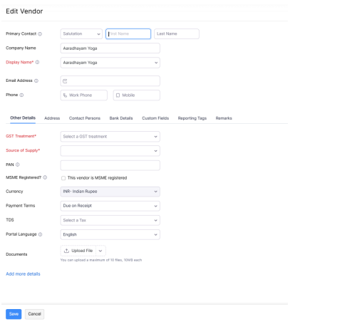Vendor Information: Similar to customers, vendor information like name, contact details, and other information are mapped to the vendor fields in Zoho Books.
